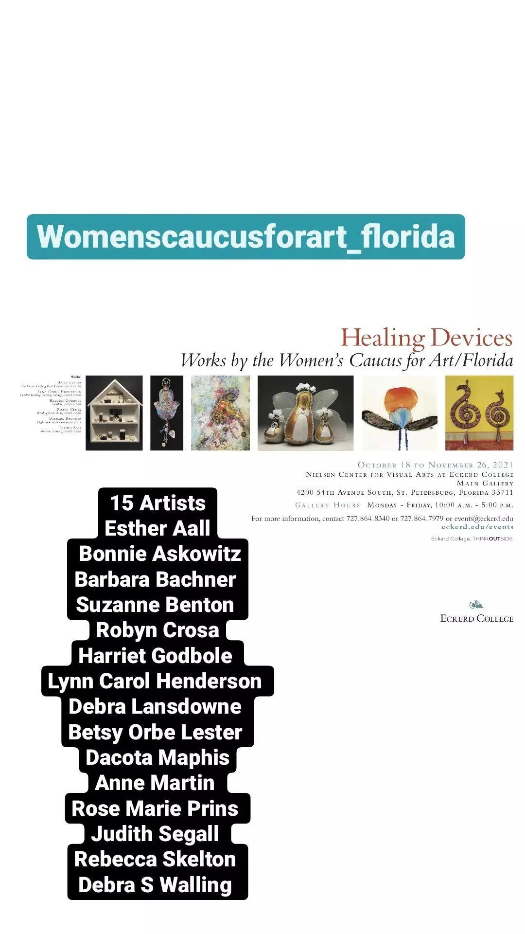 In 2022 HEALING DEVICES has shown at several different venues in Florida: Nielson Gallery for Visual Arts at Eckerd College, Palm Harbor Library, Carrollwood Cultural Center’s Featured Artist Gallery, and Art House in Casselberry