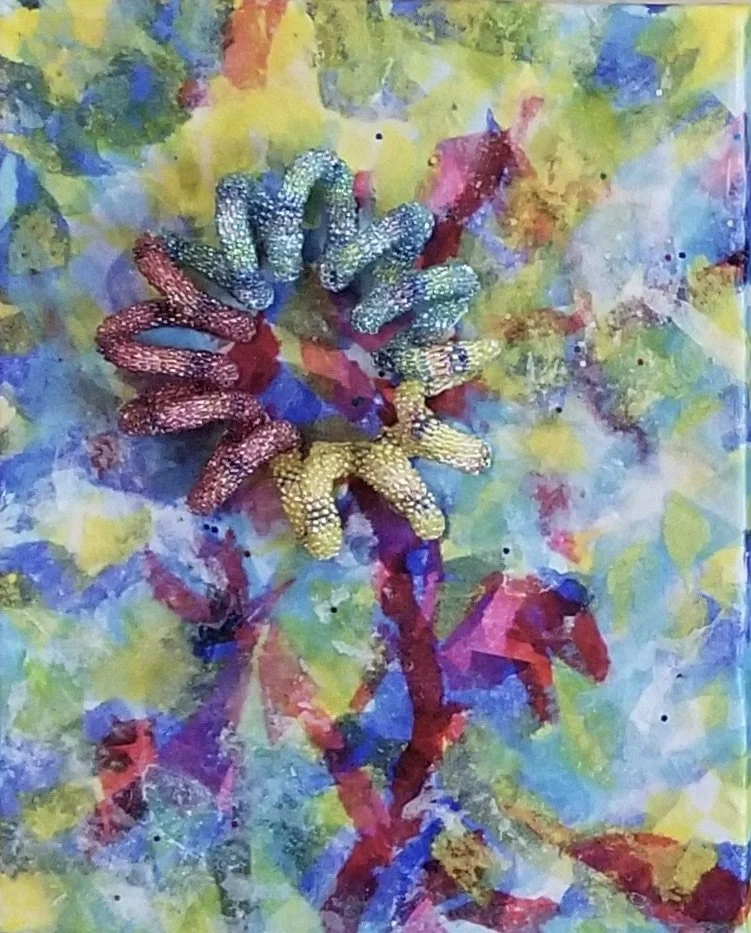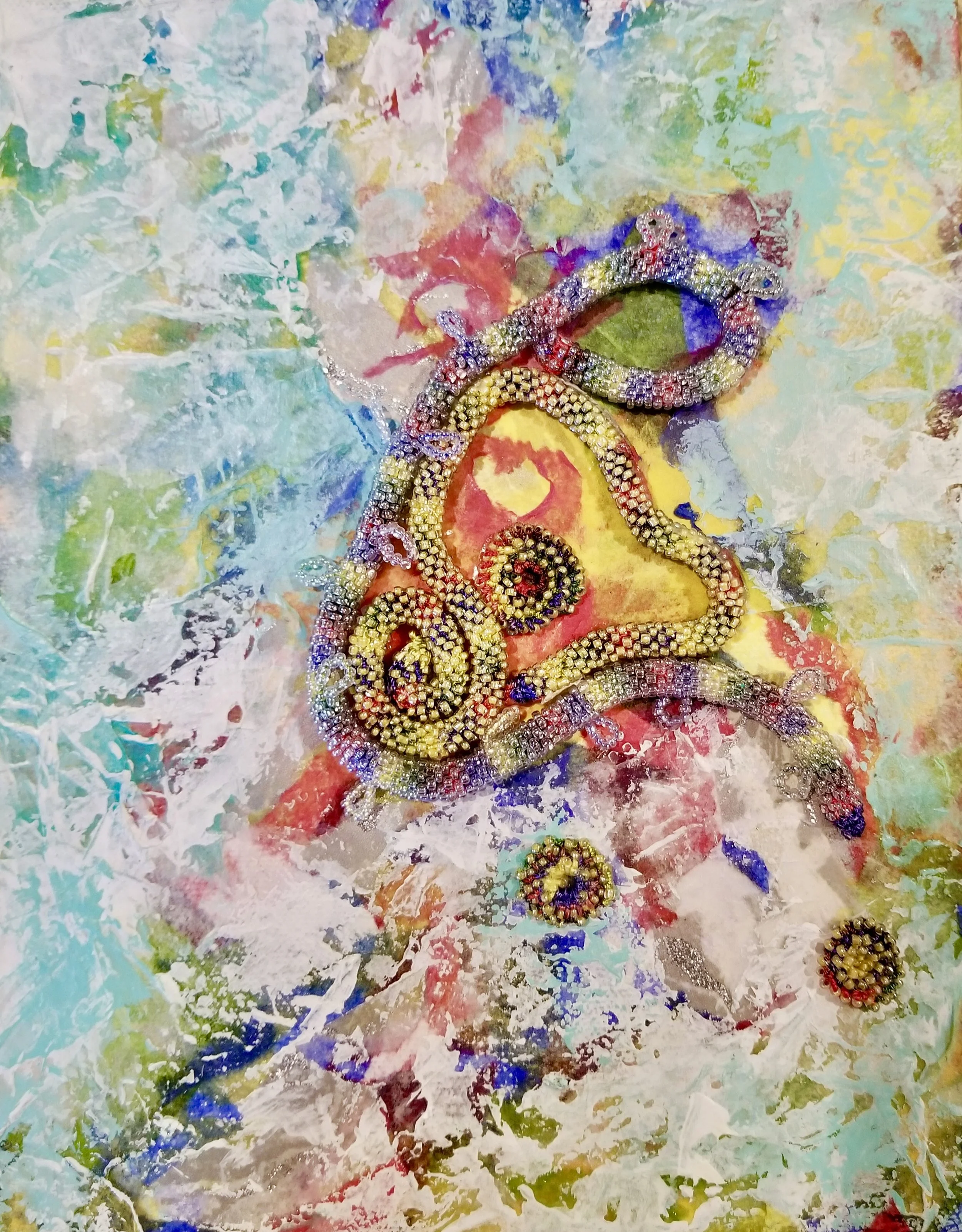 These 10”X8” mixed media canvases are made using collaged and applied elements such as paper, paint and handmade bead crochet ropes. Each bead touches our healing needs. The Pandemic, our reaction to it, and how the world has chosen to deal with it has created a need. We reach out and connect in ways that remind us of the importance of respect and the need for common sense and decency.