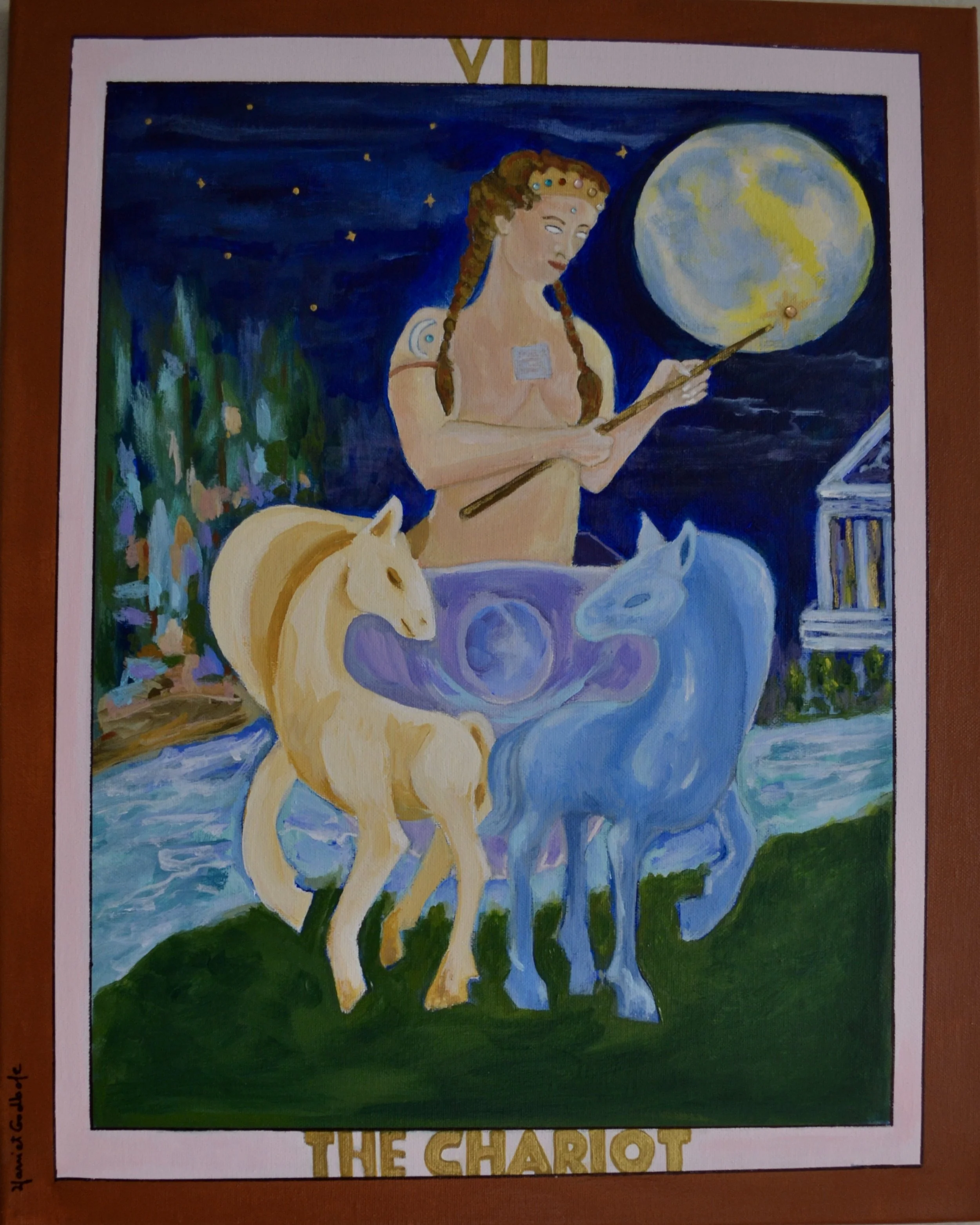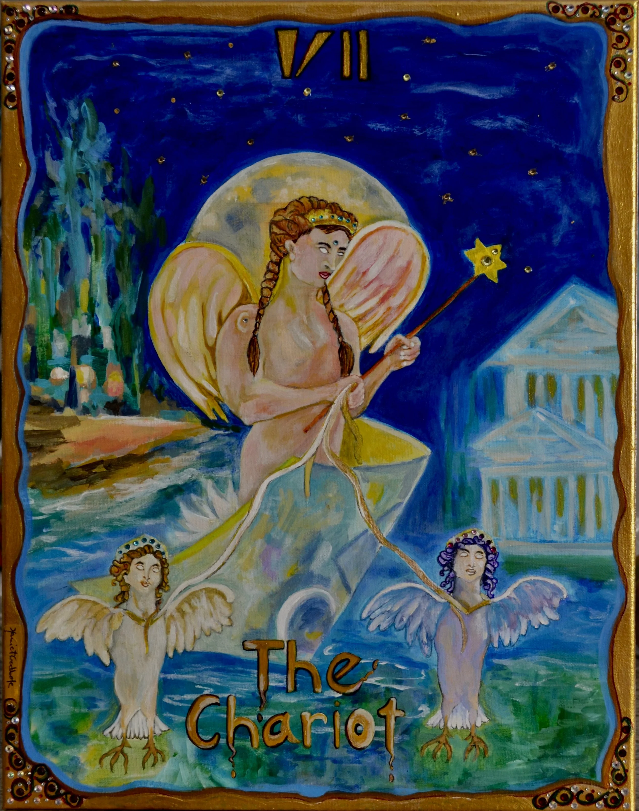 My Piece is The Chariot Card. I did two versions. The originals are 20”X16” unframed. They will be made into cards as part of an entire Tarot Deck. The Deck is available for $35